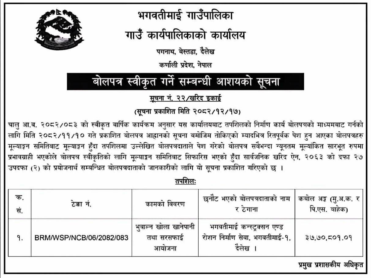 Home » बोलपत्र स्वीकृत गर्ने सम्बन्धी आशयको सूचना ।