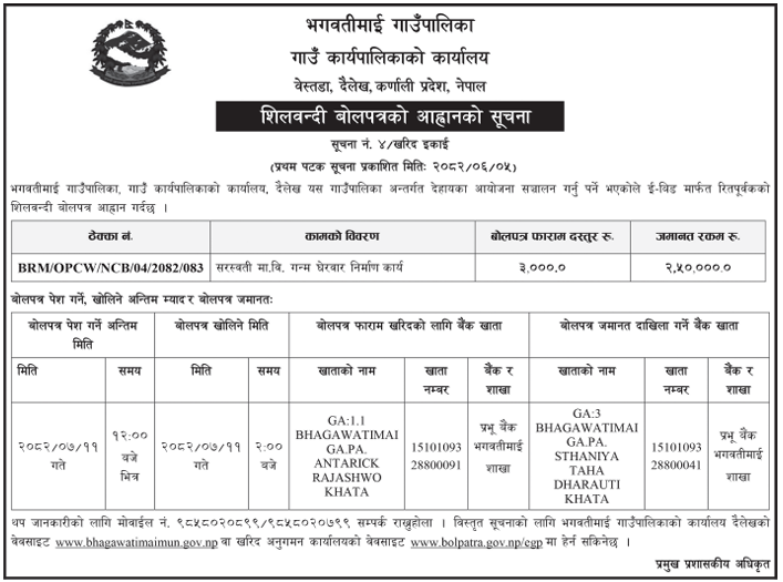 शिलबन्दी बोलपत्र आह्वानको सूचना । सरस्वती मा.वि. गन्म ।