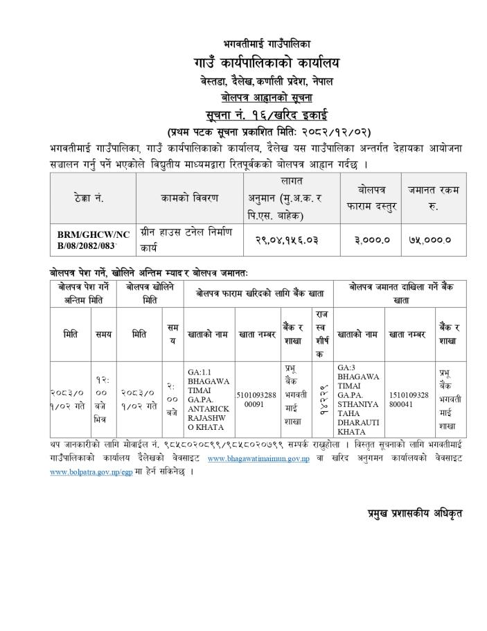 बोलपत्र आह्वानको सूचना । २२ वटा ग्रिन हाउस टनेल निर्माण कार्य । नेपाल समाचारपत्र २०८२/१२/०२ गते ।