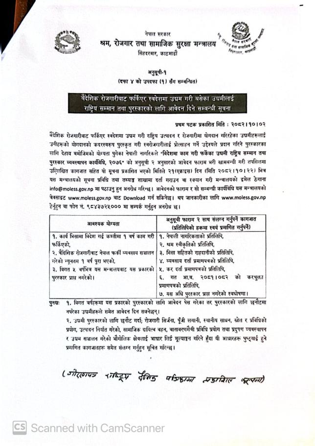वैदेशिक रोजगारीबाट फर्किएर स्वदेशमा उद्यम गरी बसेका उद्यमीलाई राष्ट्रिय सम्मान तथा पुरस्कारको लागि आवेदन दिने सम्वन्धी सूचना !!