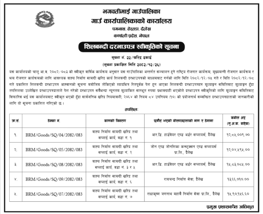 Home » शिलबन्दी दरभाउपत्र स्वीकृत सम्बन्धि सूचना ।