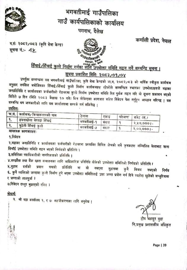 सिँचाई/सिँचाई कुलो निर्माण गर्नका लागि में उपभोक्ता समिति गठन गर्ने सम्बन्धि सूचना ।