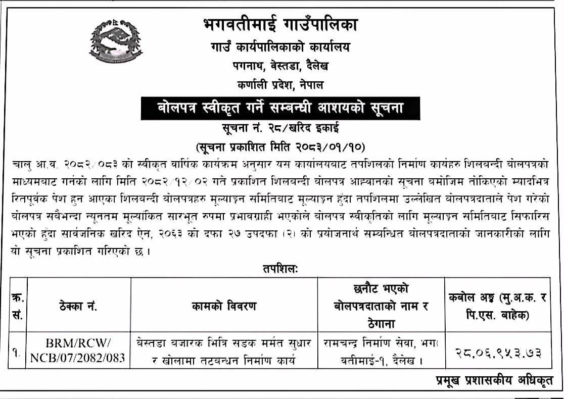 Home » बोलपत्र स्वीकृत गर्ने सम्बन्धी आशयको सूचना ।